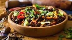This traditional version of Ajapsandali is a colorful medley of eggplant, bell peppers, and tomatoes, simmered until tender. The key to its rich flavor is the combination of fresh herbs like coriander and basil, which adds a fragrant touch to the dish. It’s cooked slowly to let all the vegetables mingle and become best friends in flavor!