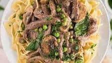 Rating: 4.8. Ingredients: Flank steak, wide egg noodles, sour cream, white wine, baby bella mushrooms Total Time: 30 min.