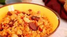 Rating: 5. Ingredients: Skinless chicken thighs, andouille sausage, white rice, hot sauce, chicken broth Total Time: 2 hr.