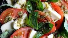 Rating: 5. Ingredients: Pesto sauce, fresh mozzarella balls, cherry tomatoes, balsamic glaze, olive oil