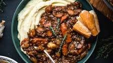 Rating: 4.9. Ingredients: Chicken thighs, chicken drumsticks, red wine, pearl onions, mashed potato Total Time: 1 hr 45 min.