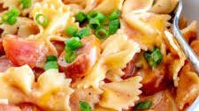 Rating: 5. Ingredients: Smoked sausage, bow tie pasta, cheddar cheese, heavy cream, diced tomatoes Total Time: 25 min.