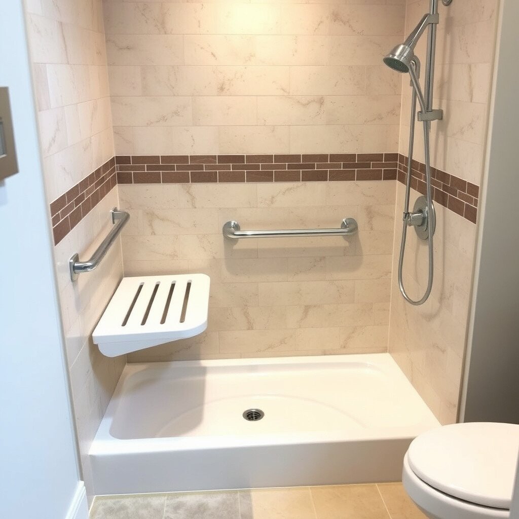 Consider adding a bench or a fold-down seat for added comfort. Choose non-slip tiles and a handheld showerhead for extra safety and convenience. This design is both trendy and practical.