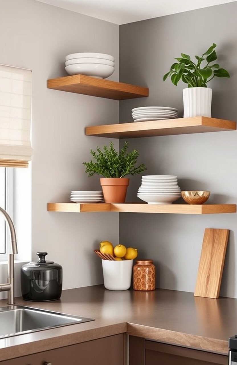 Floating shelves offer sleek storage solutions. They’re perfect for displaying dishes, plants, or decor.