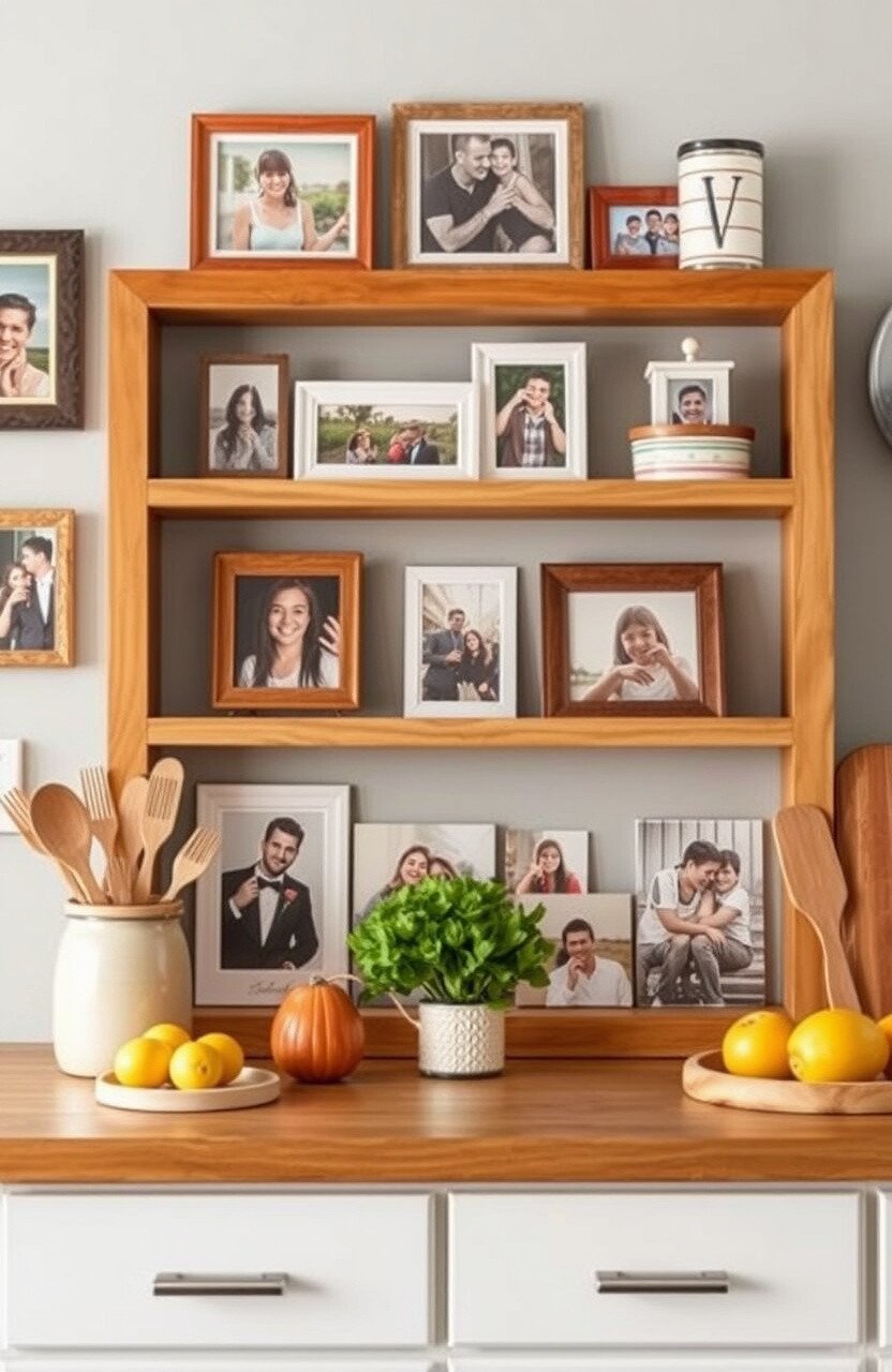 Personalize by arranging photos in different patterns or themes. It’s a heartwarming way to make your kitchen feel like home.