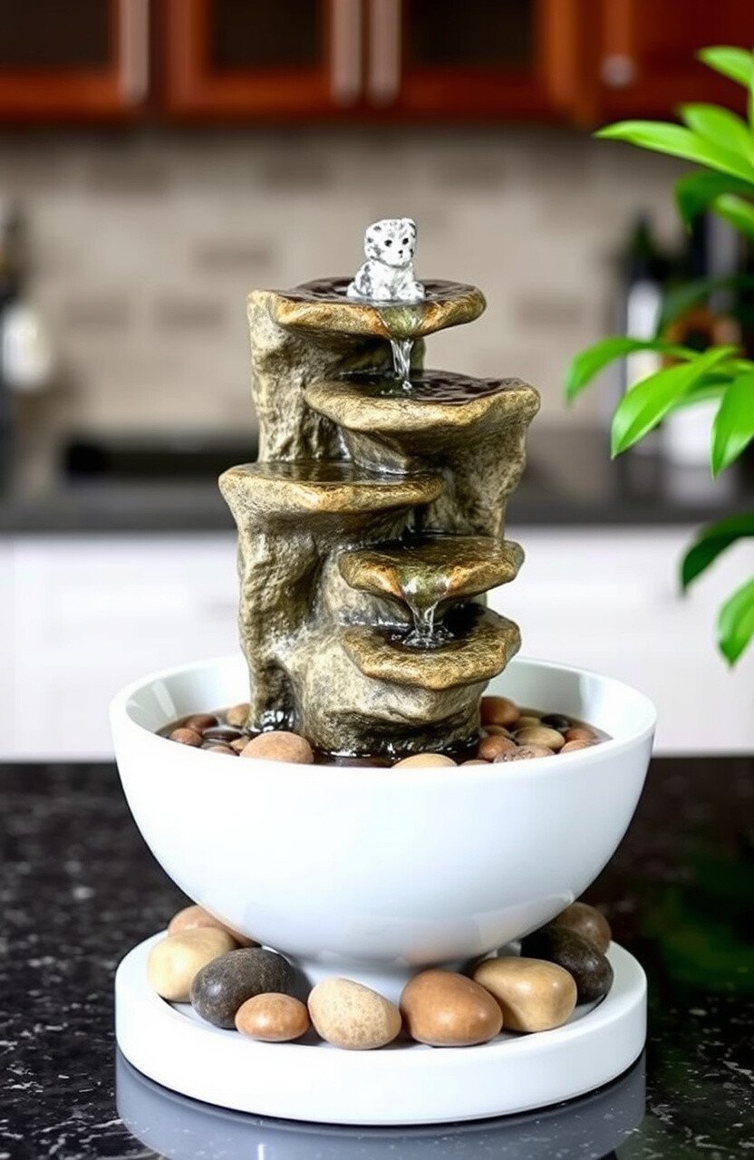 A tabletop water fountain adds tranquility to your kitchen. It’s a small feature with a big impact.
