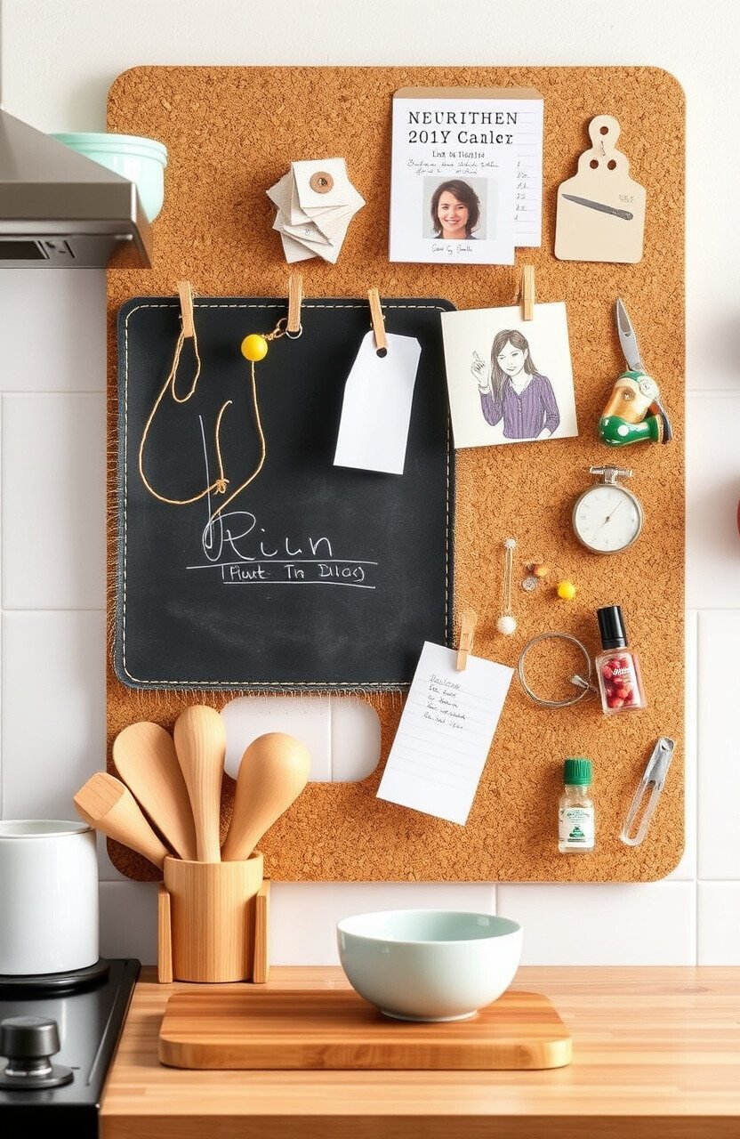A cork board organizer keeps your kitchen tidy and efficient. Use it for notes, recipes, or reminders.