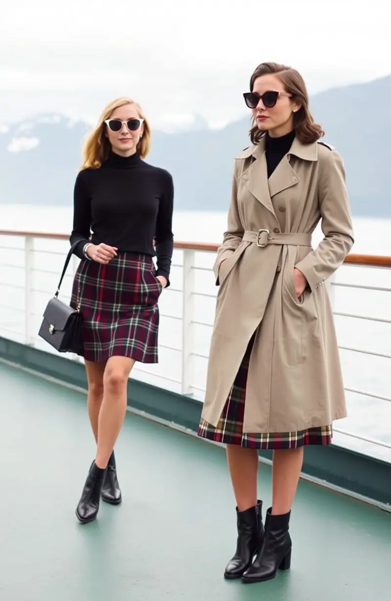 Channel retro vibes with a plaid skirt and turtleneck combo. Add a trench coat for an added layer of sophistication.
