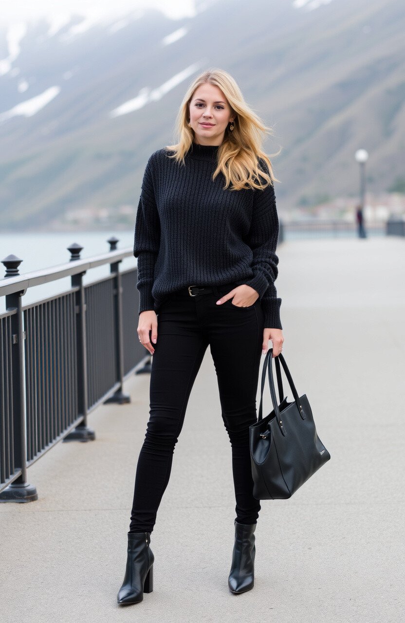 For a timeless look, choose a monochrome outfit. Black jeans with a charcoal sweater create a sleek, sophisticated appearance.