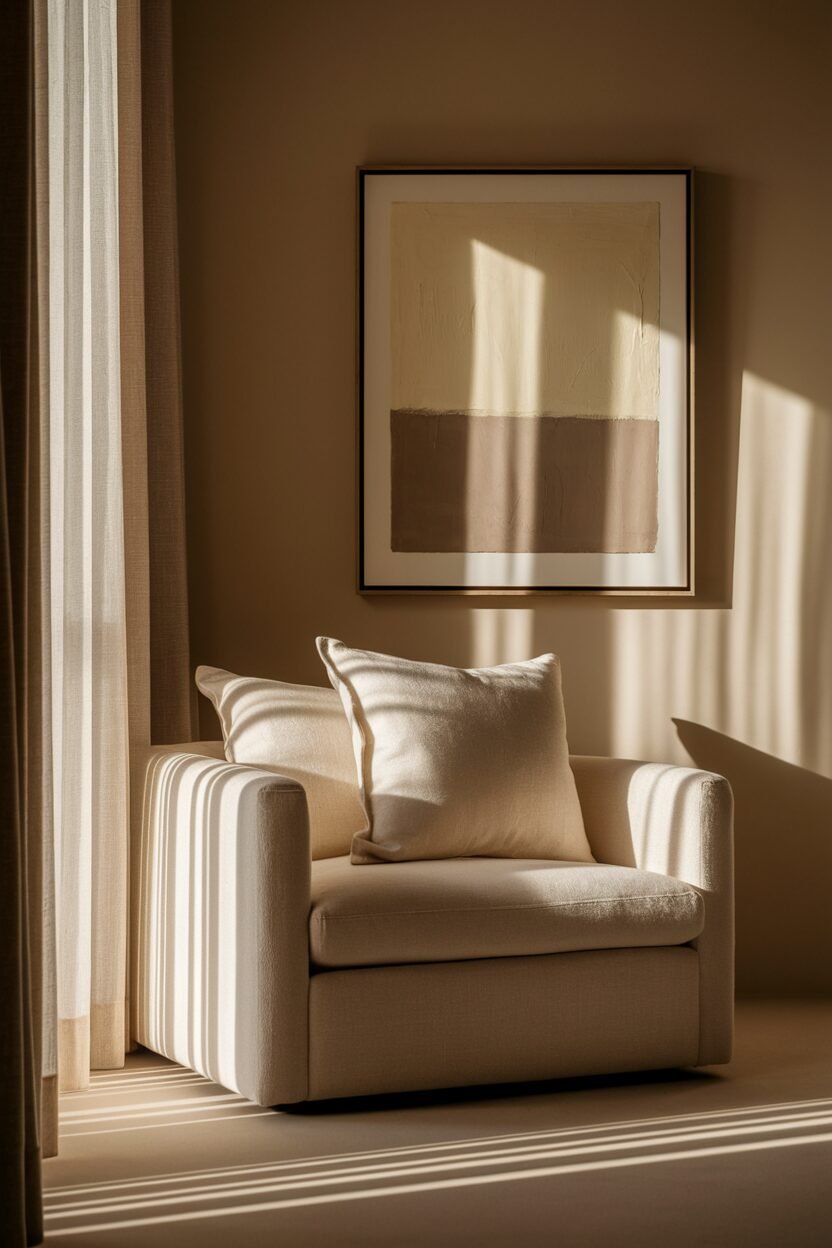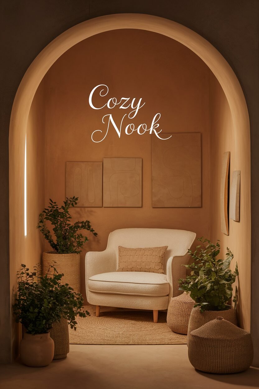 Create a cozy reading nook with a soft chair and a neutral throw blanket. This little corner can become your favorite spot to relax and unwind.