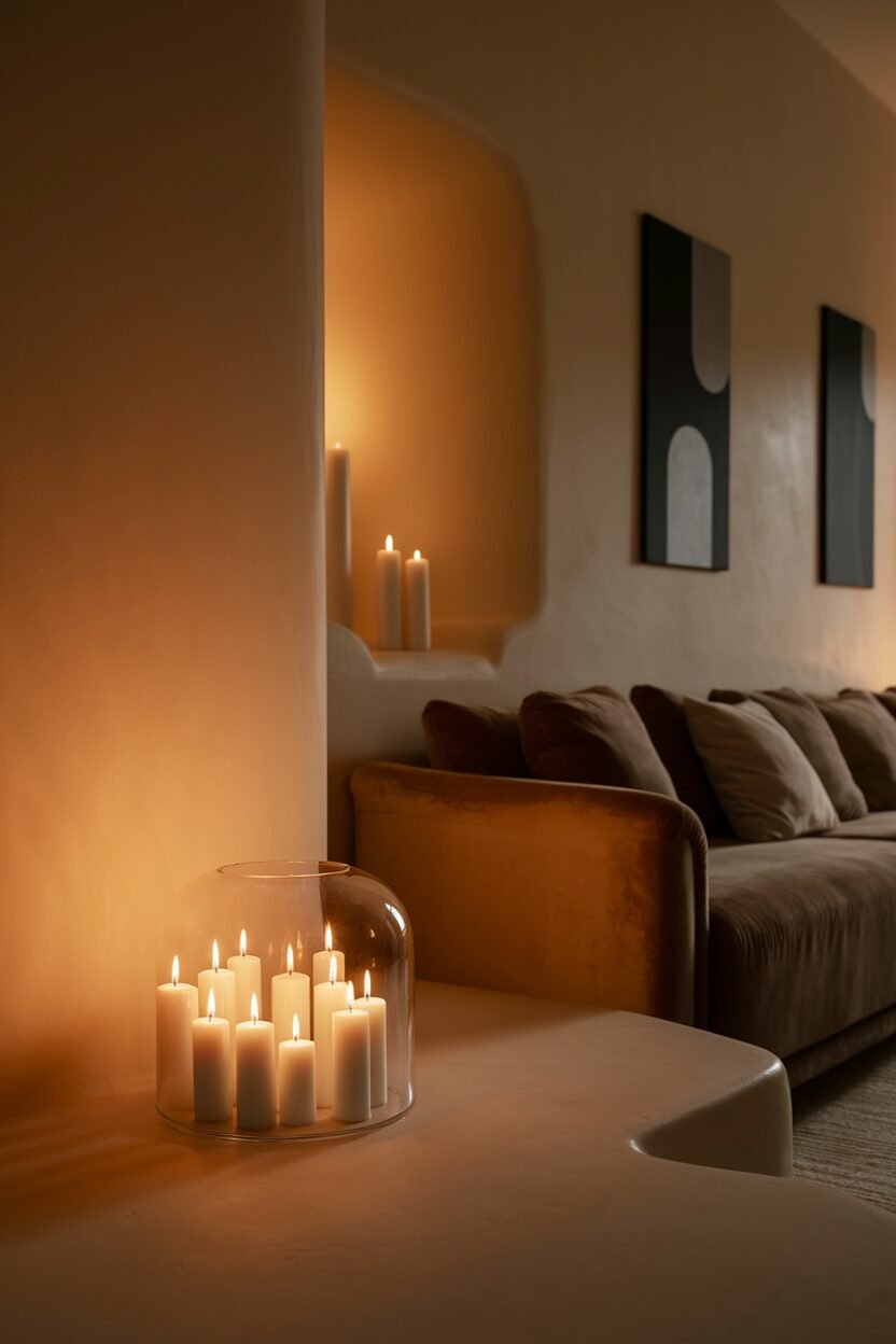 Arrange simple candles in neutral tones for a cozy, inviting vibe. Use various heights and textures to create an appealing display.