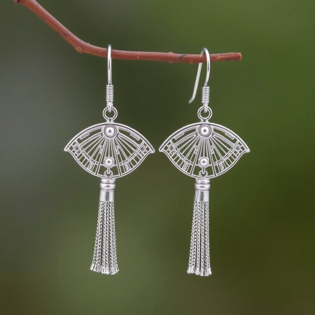 These earrings resemble tiny silver fans with tassels. They sway gently with every step you take, adding a playful touch to your outfit. The combination of silver and tassels is truly eye-catching.