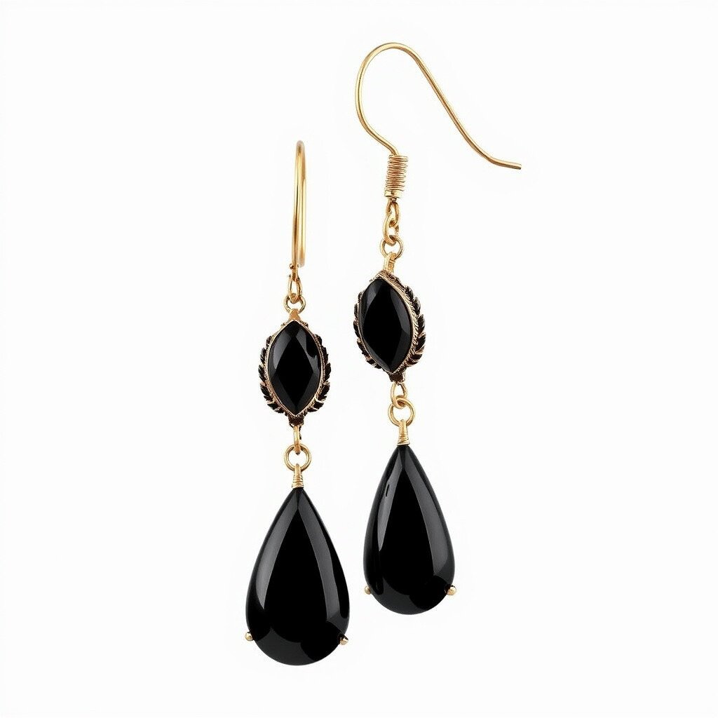 These earrings feature sleek black onyx stones. They’re mysterious and bold, perfect for a dramatic look. The drop design gives them a classic feel.