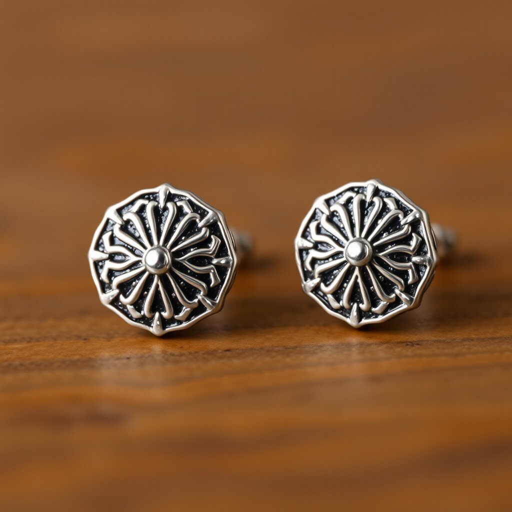 These studs feature intricate Art Deco patterns in silver. They are simple yet stylish, perfect for everyday wear. The design is subtle but impactful.