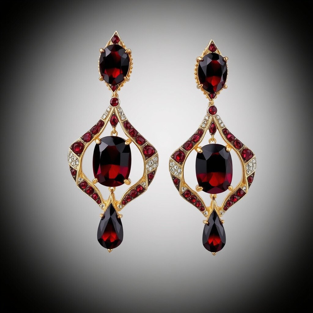 Deep red garnet stones set in a unique design make these earrings a bold choice. They are dramatic and elegant, perfect for a night out.