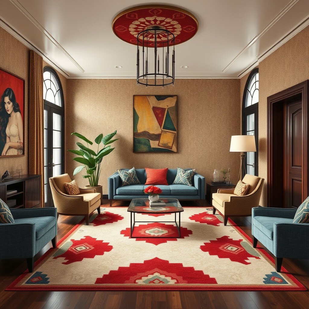 Rugs anchor a room. In Art Deco, they feature bold patterns and rich colors.