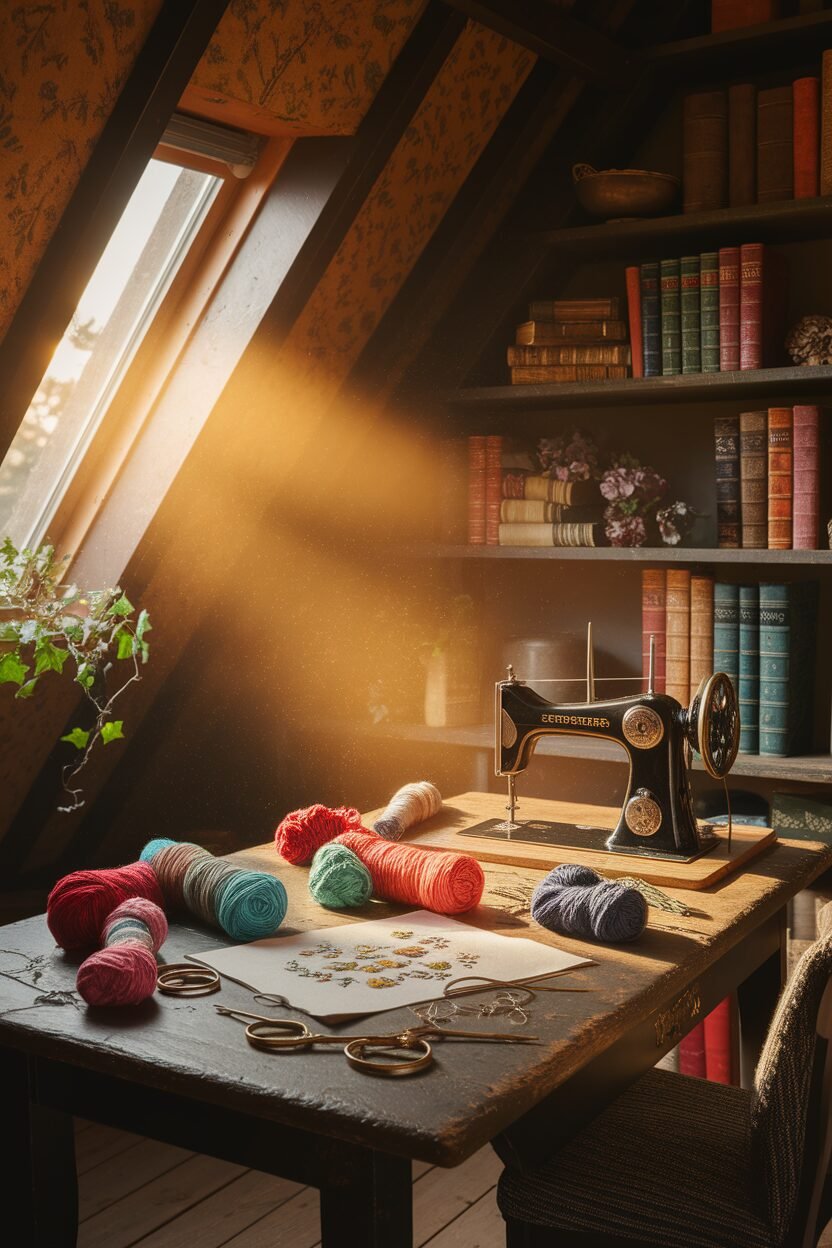 Set up a table and organize your supplies. The attic’s unique shape adds character. Add storage for fabrics, papers, and tools.