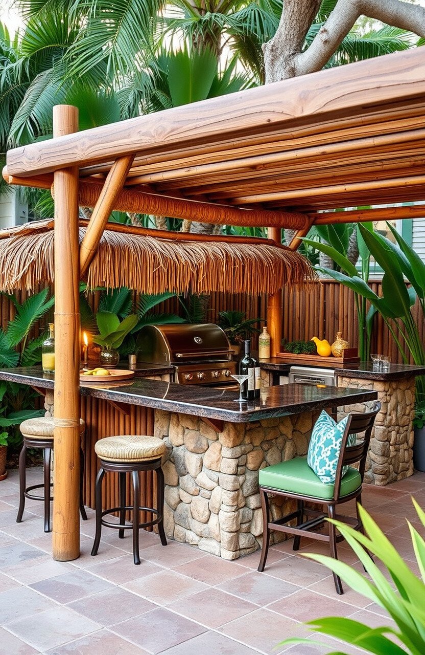 Create an oasis with a tropical-themed kitchen. Bamboo bar setups with tiki torches and lush greenery can turn your backyard into a paradise.