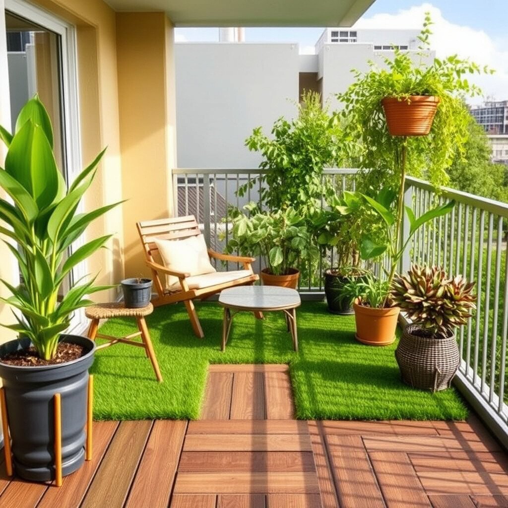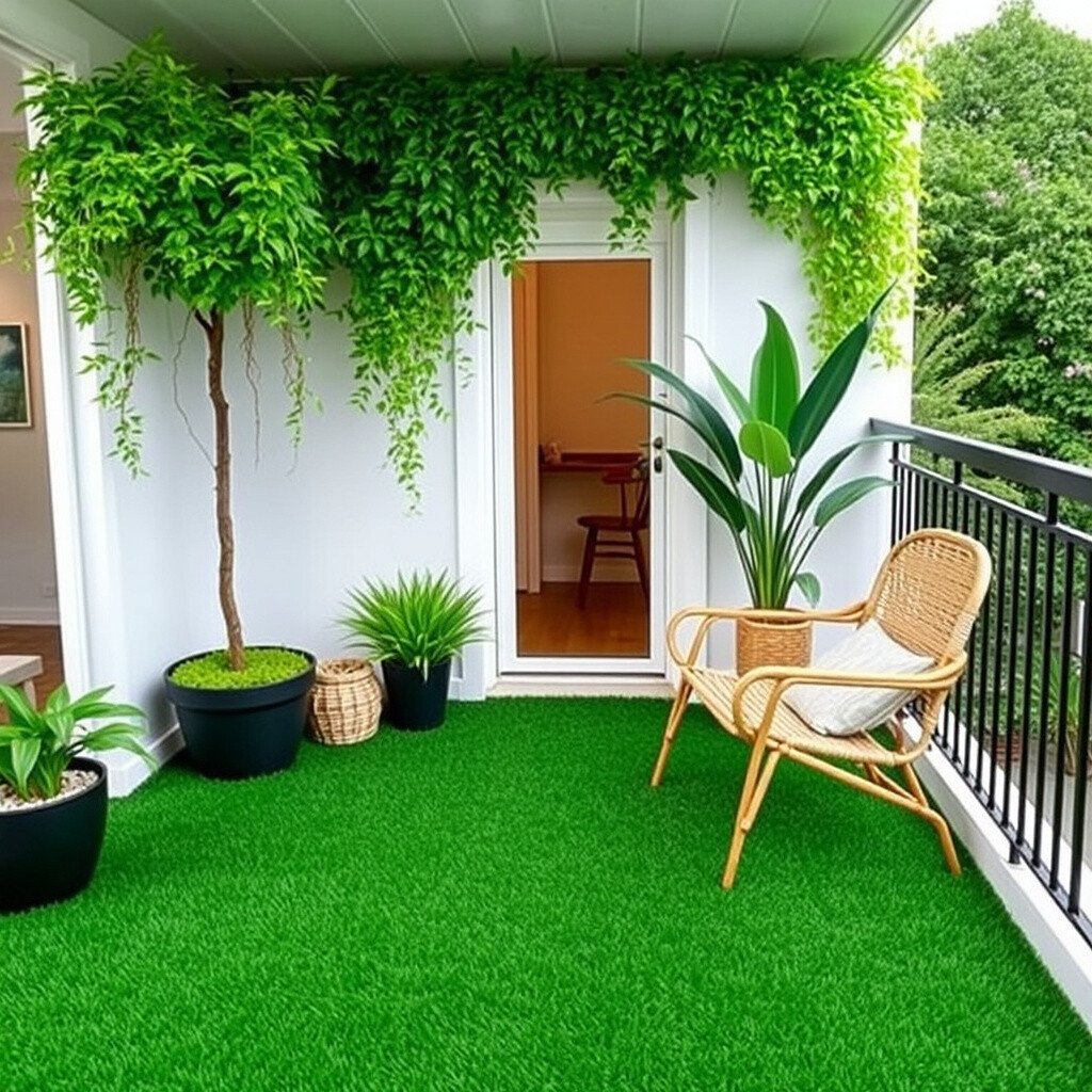 Bring the feel of a lush garden to your balcony with artificial grass. It’s soft, green, and maintenance-free.
