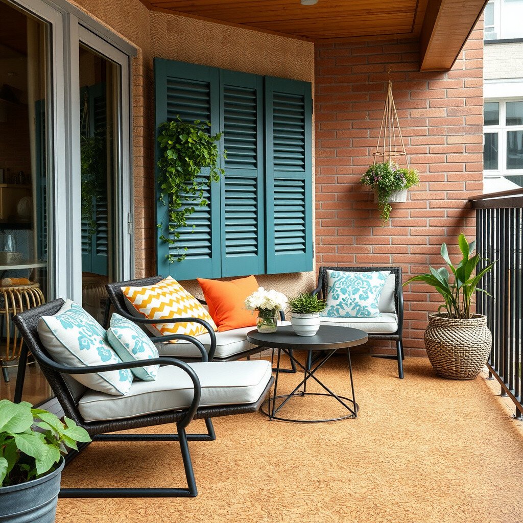 Pair cork flooring with bright cushions and a small table for a charming balcony retreat. It’s an excellent choice for those seeking comfort and sustainability.