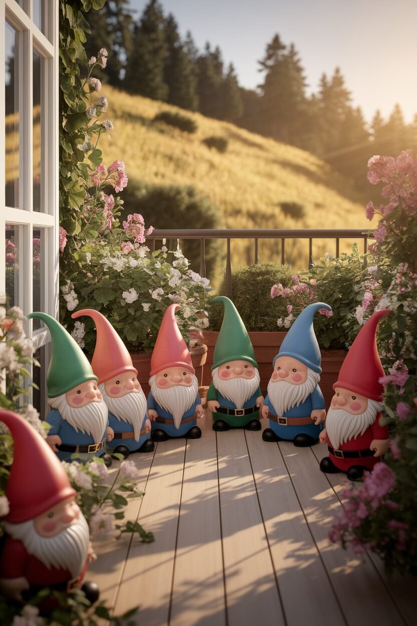 Adding playful garden gnomes can bring whimsy to your balcony. These little characters add a fun touch to your outdoor space!