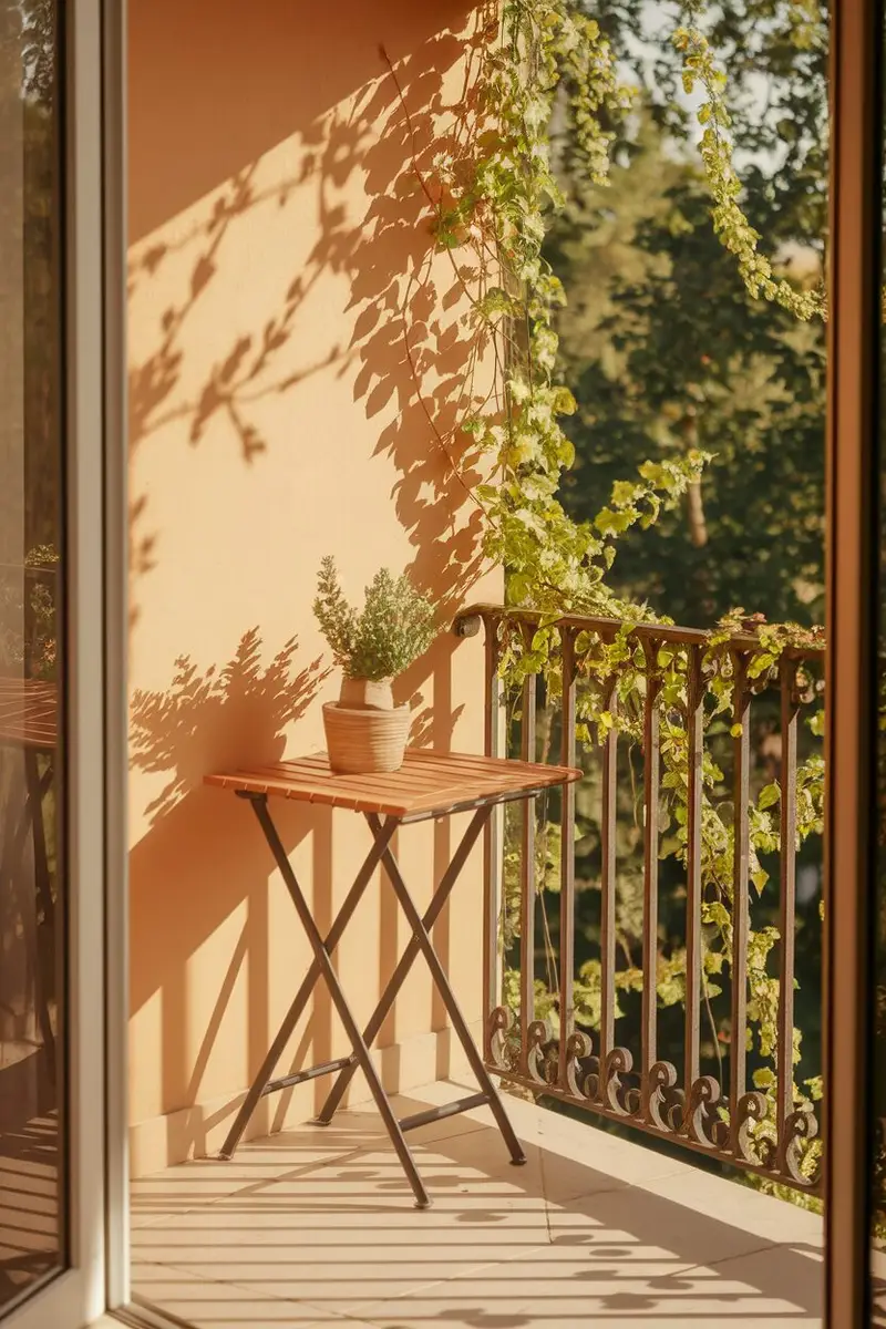A wall-mounted folding table can be a space-saver on smaller balconies. It’s perfect for dining or working outside without taking up too much room.