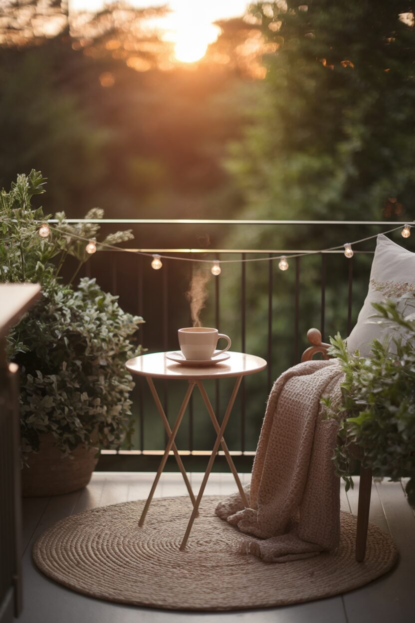 Your balcony can be the ultimate coffee oasis, perfect for savoring each sip of your morning brew. Picture a small table with two chairs sitting on a lovely rug, surrounded by twinkling string lights.
