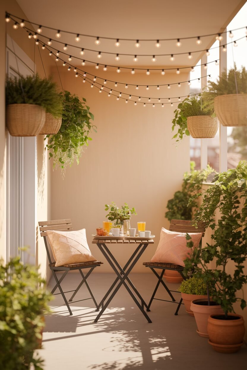 Imagine enjoying a leisurely breakfast surrounded by cheerful decor. A small table with a vibrant rug and soft lights can turn your balcony into a delightful breakfast corner.