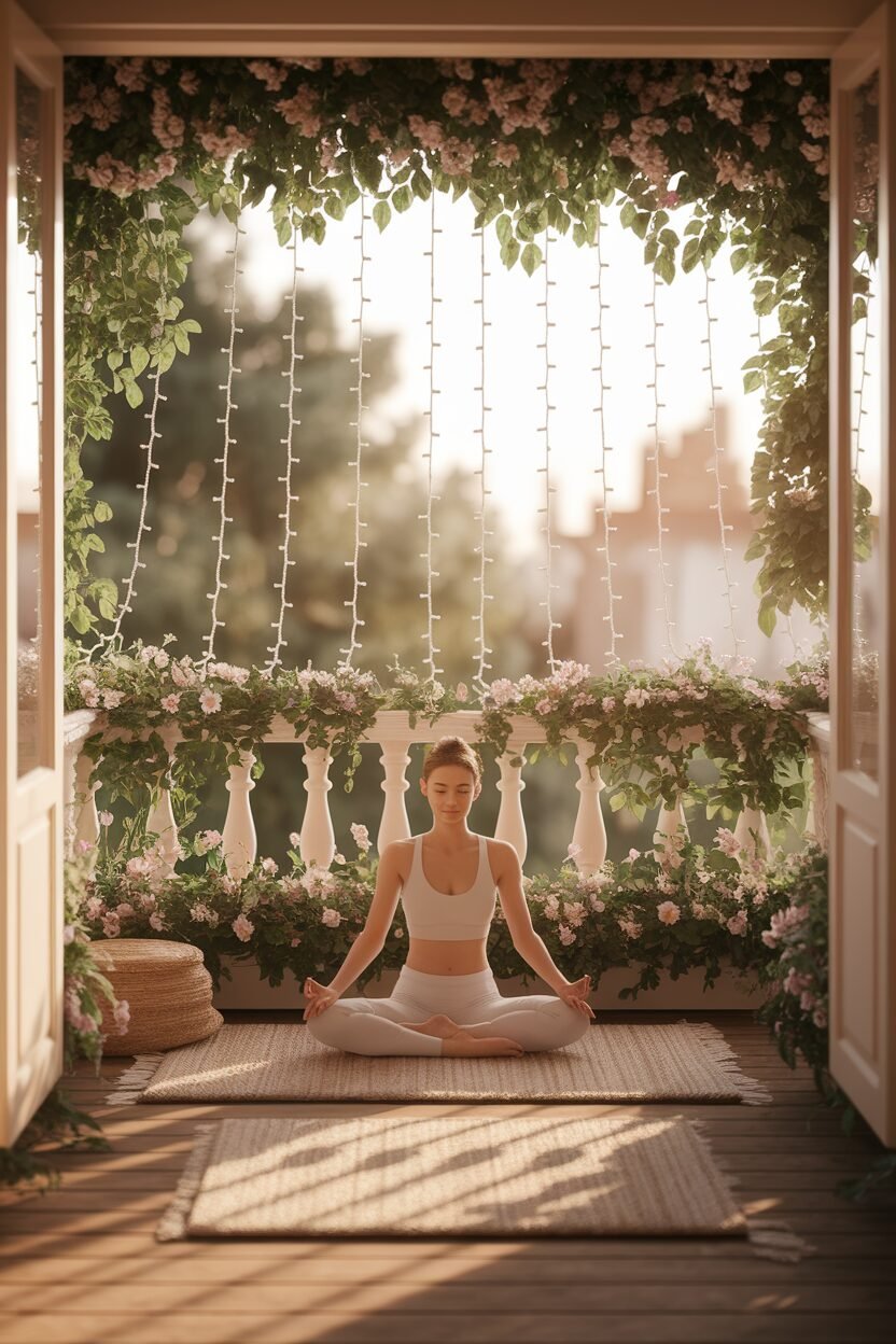 Turn your balcony into a peaceful yoga retreat, perfect for morning stretches. Lay down a yoga mat on a cushy rug and let the string lights inspire you to breathe deeply.