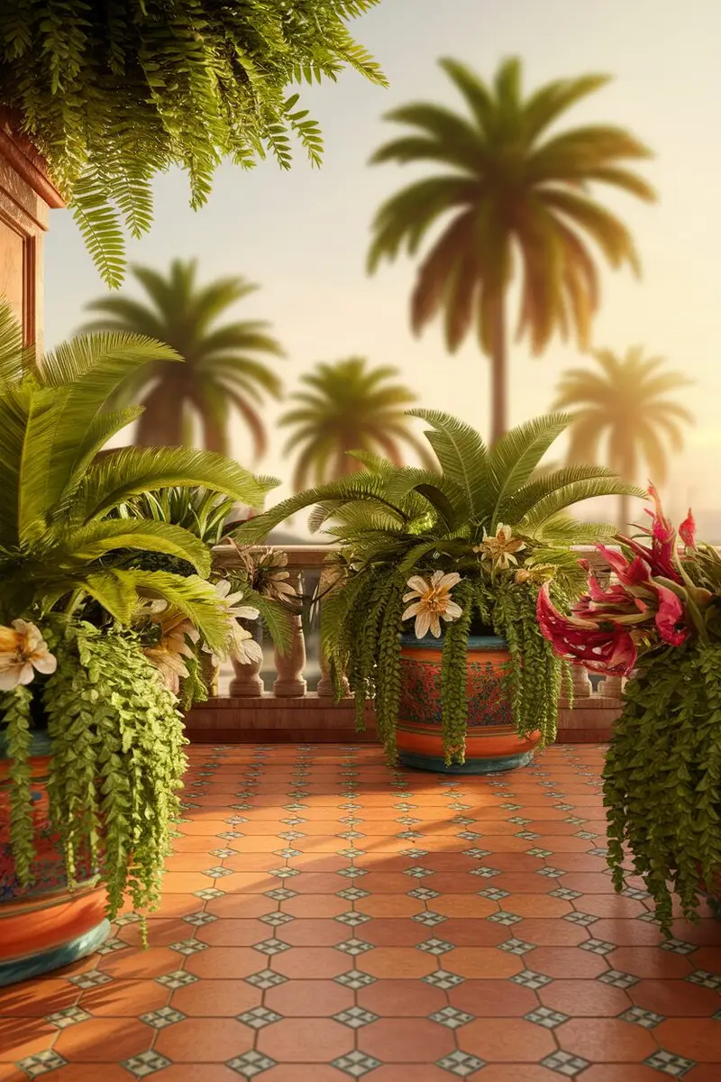 Imagine stepping out onto your balcony and feeling like you’re on a vacation in the tropics. Using bright, patterned tiles paired with lush green plants like ferns and palms can bring that beachy vibe home.