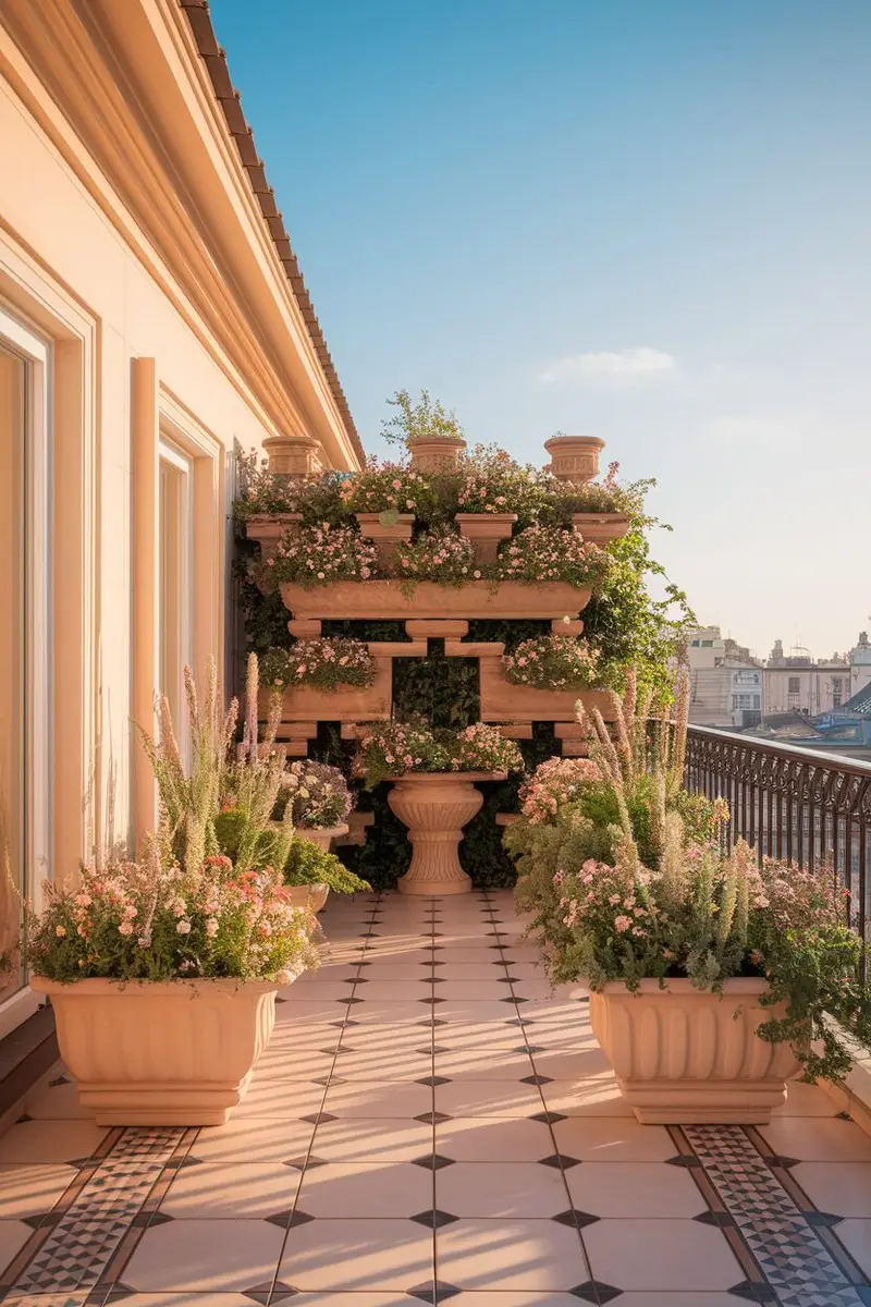 Create a romantic evening retreat on your balcony for those special moments. Use soft, muted tiles with elegant planters filled with fragrant flowers, like jasmine or lavender.