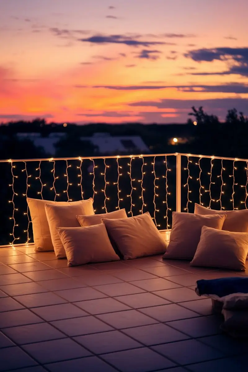 Picture this: an evening lounge area with soft lighting and comfy throw pillows. String lights can make your balcony feel magical as the sun sets.
