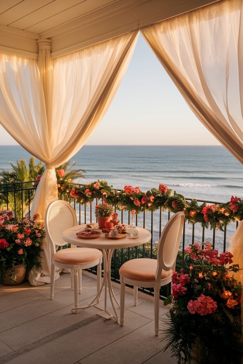 <pThis setup can enhance your ocean view while providing a cozy ambiance for late-night chats and relaxation. It’s an easy way to add charm without needing a lot of space!