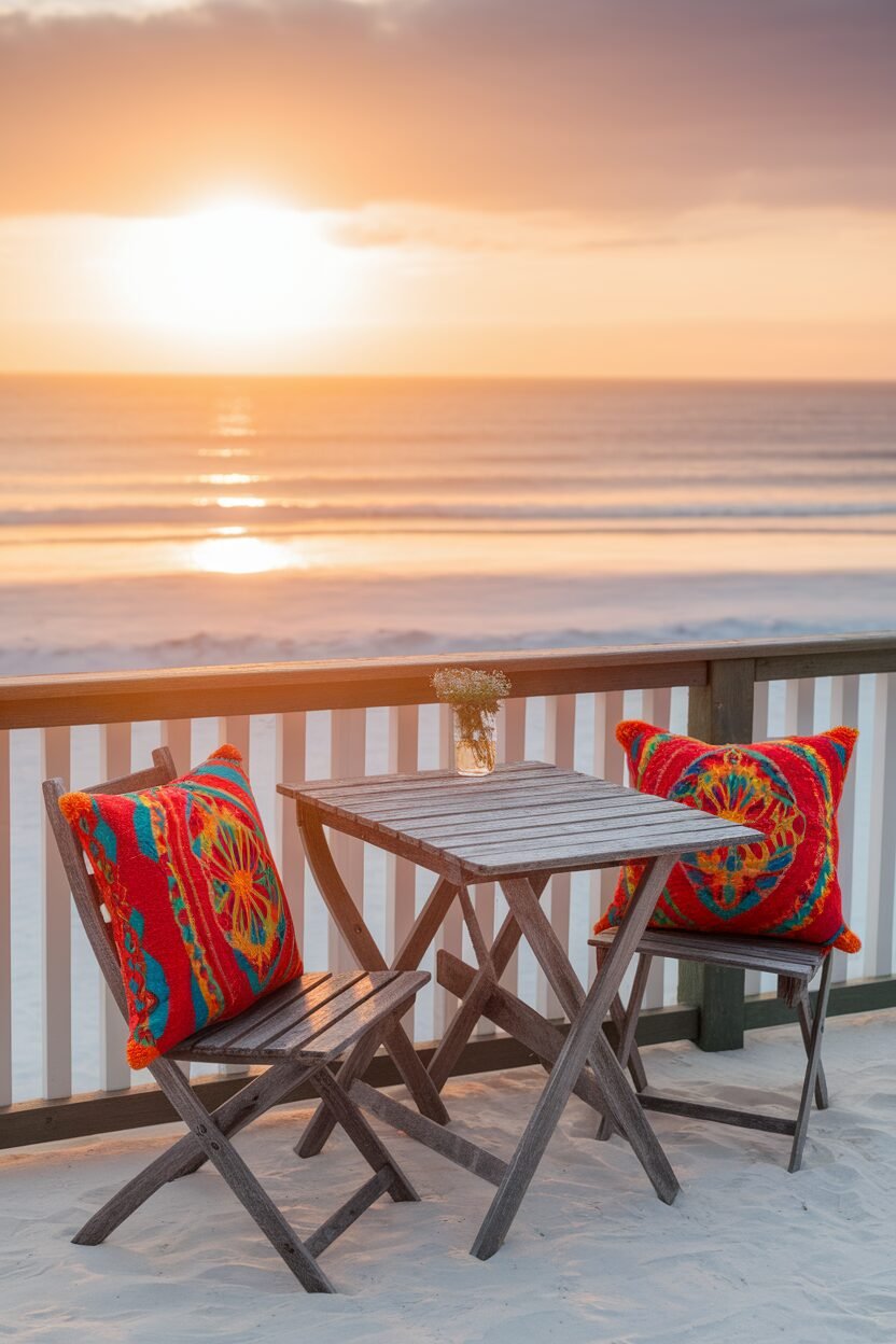 Add some flair to your balcony with colorful cushions that scream beach vibes! Think bright blues, sunny yellows, and coral pinks that mirror the ocean and sunset.