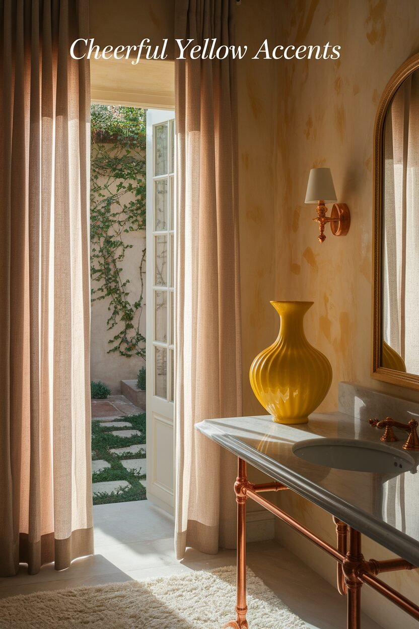Pair yellow with neutral tones for balance. You can use yellow towels, rugs, or even a painted accent wall.