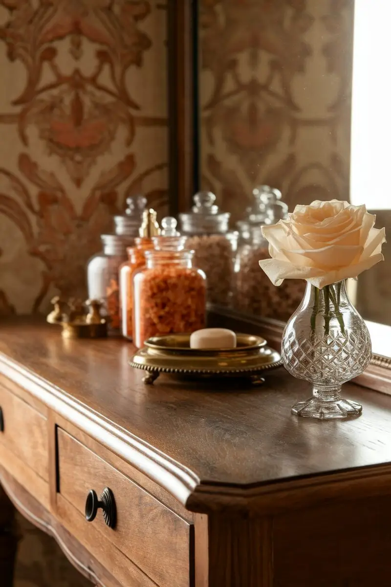 Bringing vintage elements to your bathroom counter can create a charming, nostalgic feel. Think about using antique pieces like a wooden dresser or a vintage console table!