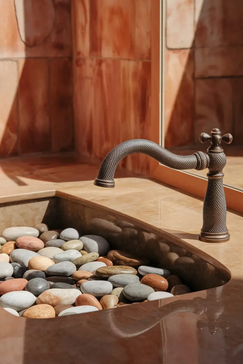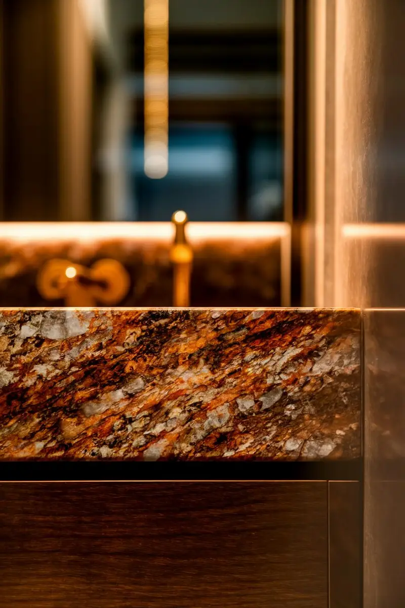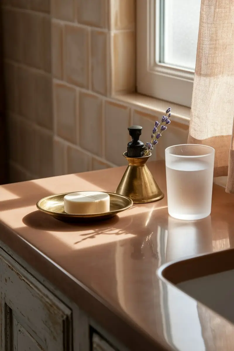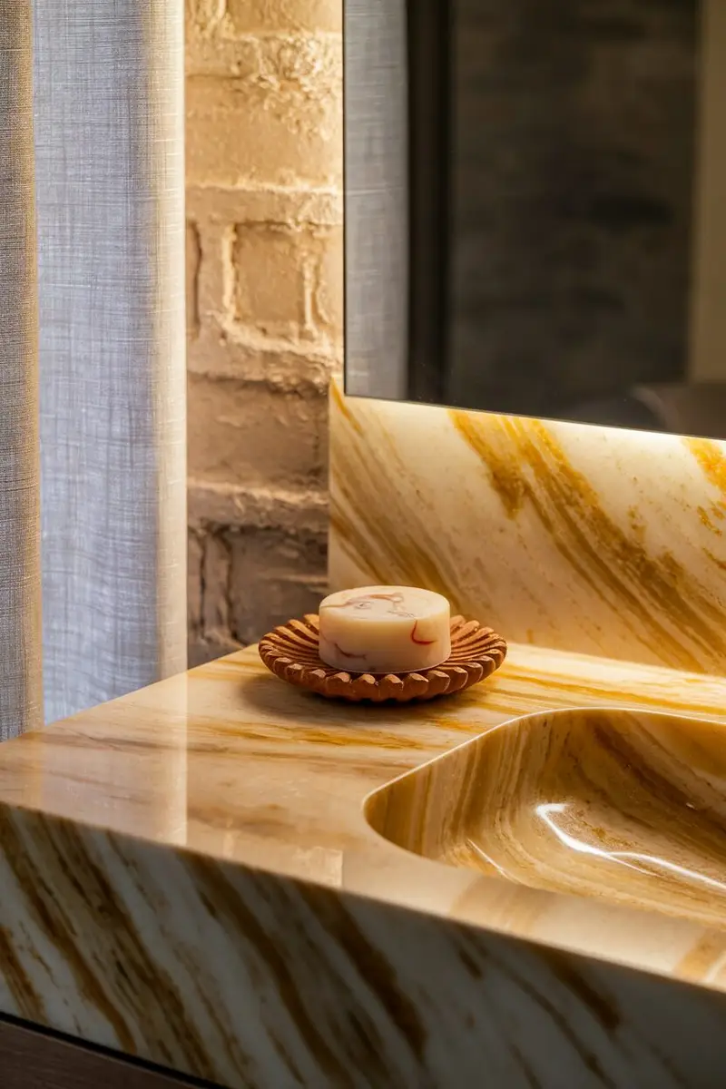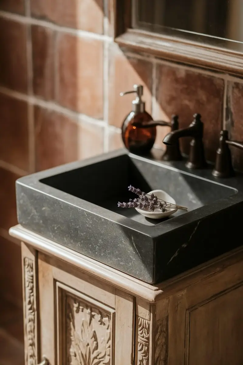 This natural stone is resistant to heat and stains, making it a practical choice for a busy bathroom. Plus, it ages beautifully, developing a rich patina over time.