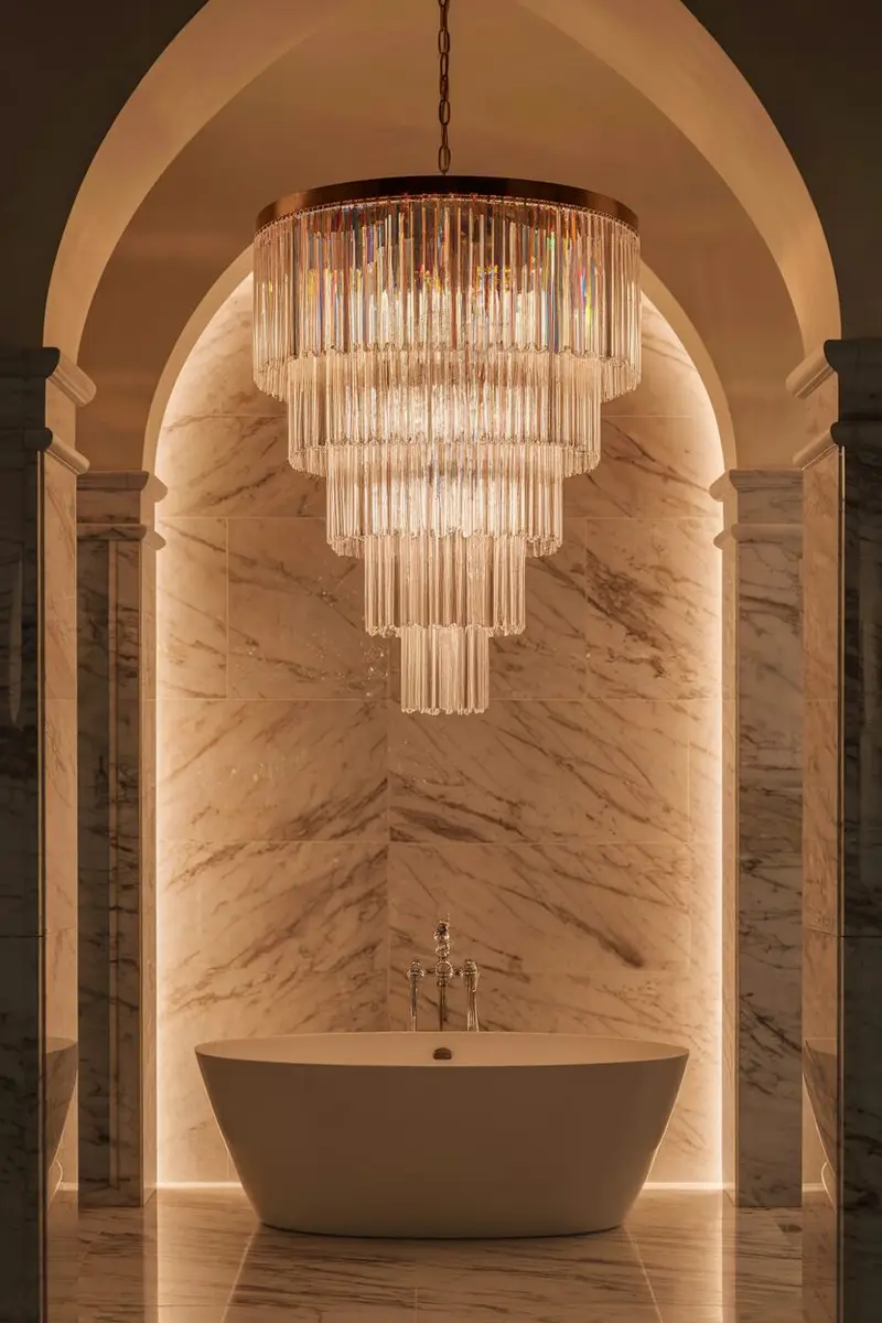 Who says chandeliers belong only in dining rooms? A glamorous crystal chandelier can elevate your bathroom to a whole new level of luxury!