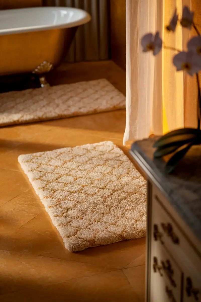 Consider layering rugs for a bohemian vibe. Mixing different textures can create an inviting and cozy bathroom atmosphere.