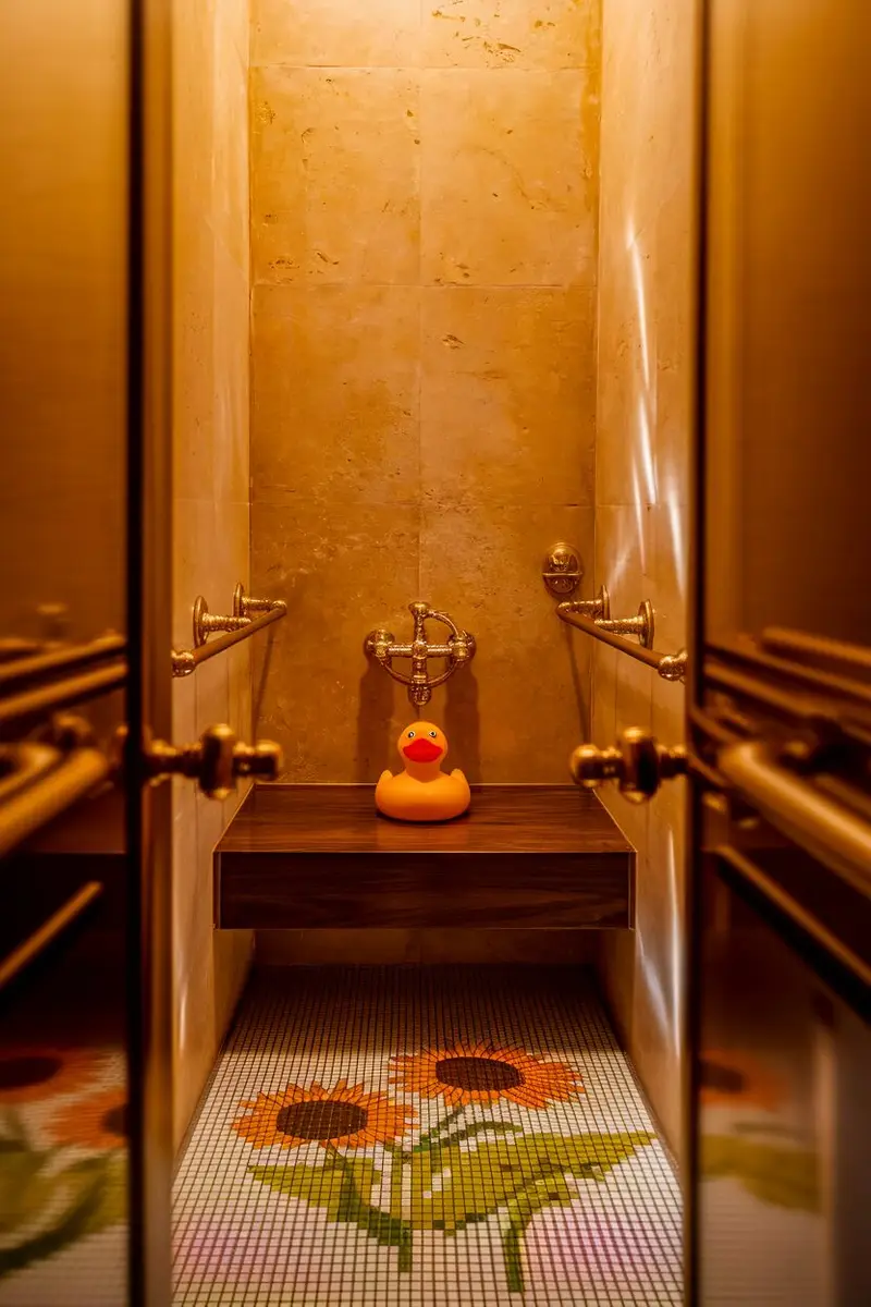 Wallpapers aren’t just for living rooms! A fun, whimsical wallpaper can turn your bathroom stall into a unique experience.