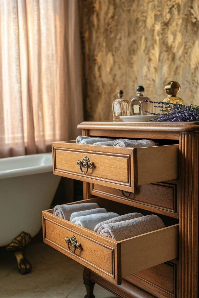 This option not only adds character but also provides plenty of space for towels and toiletries. It’s a great way to give new life to something you already have!