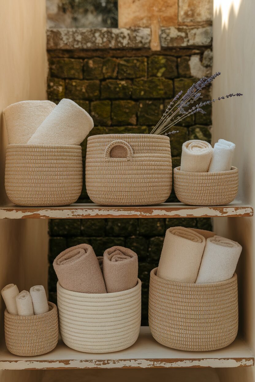Woven baskets are a stylish way to keep your bathroom organized. They come in various sizes and colors, making them perfect for any decor style.