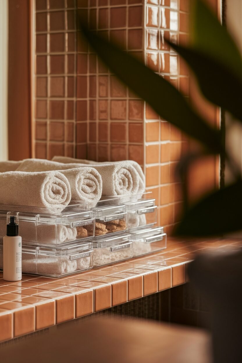 Clear containers are perfect for keeping small items organized and visible. They’re great for storing items like cotton pads, makeup, and hair accessories.