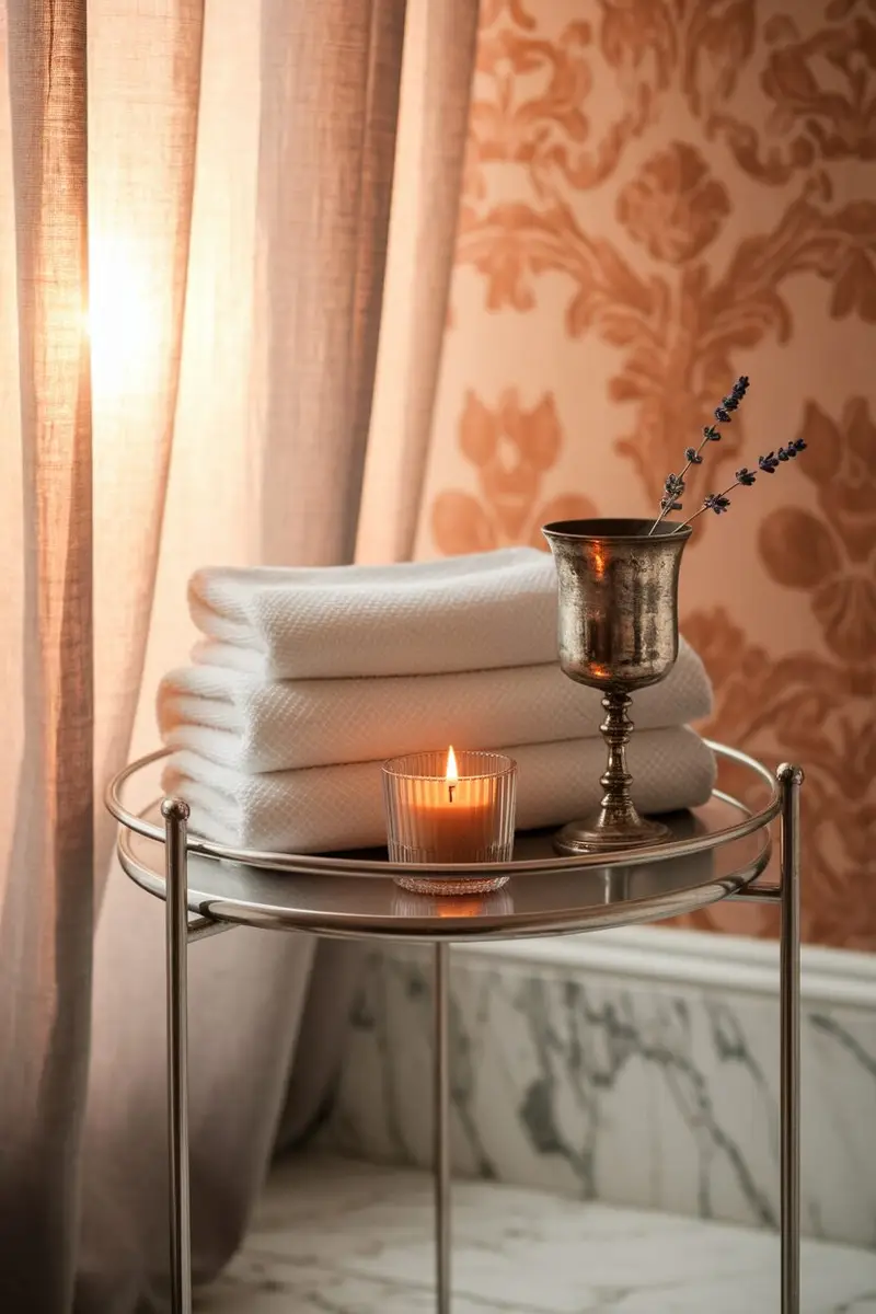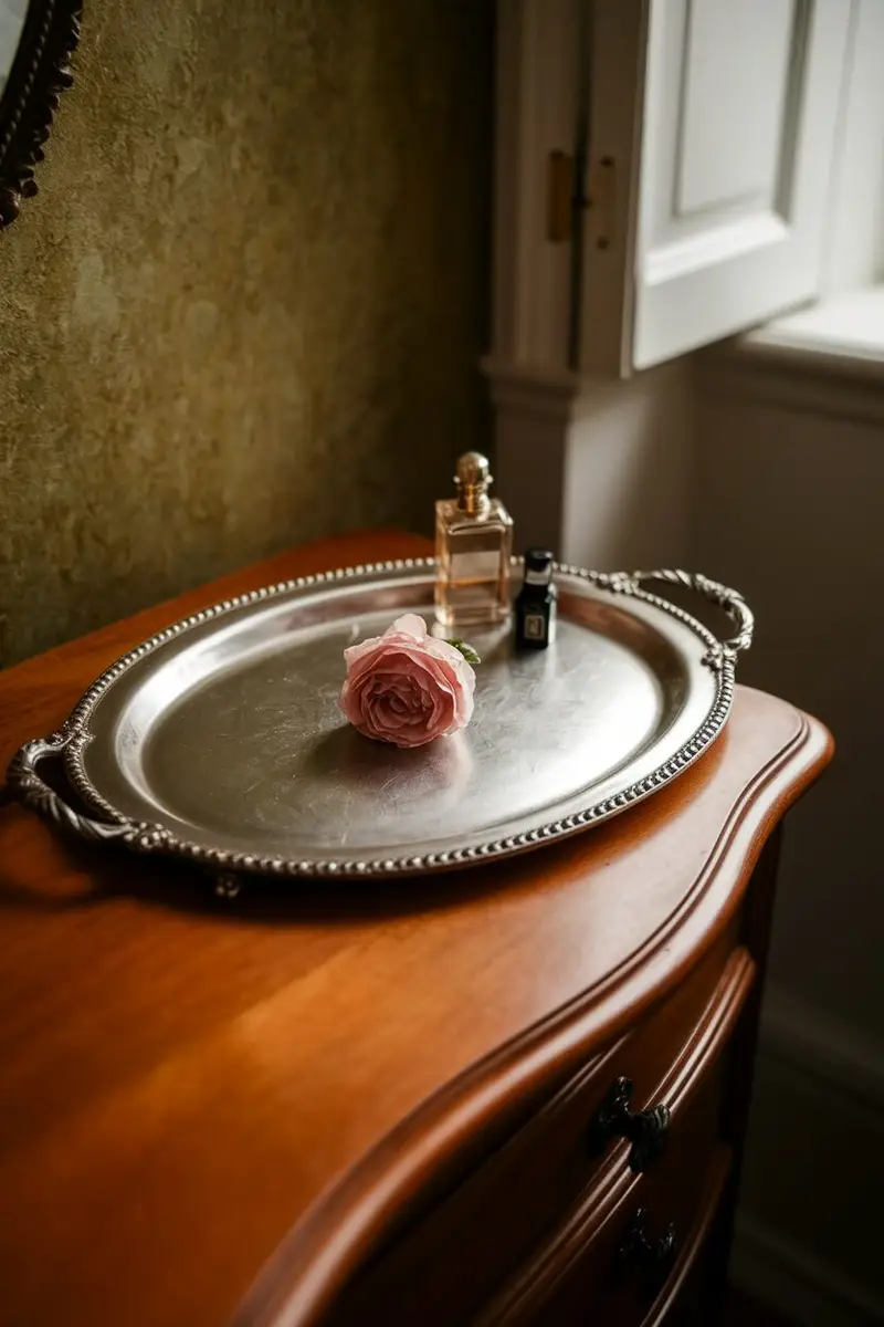 Think about using a vintage silver tray for a touch of classic elegance. The shiny surface and intricate detailing can bring a timeless beauty to your bathroom!