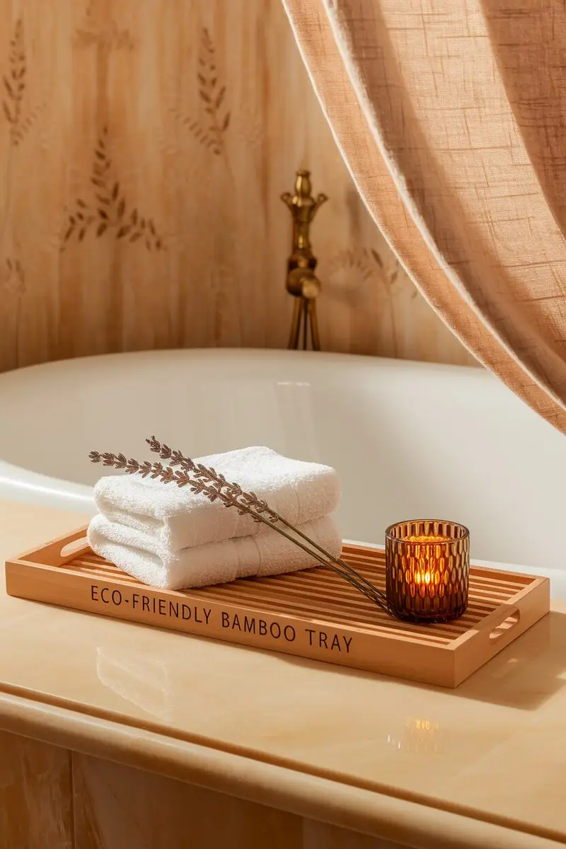 Imagine a beautiful wooden tray, with natural grains and a cozy vibe, sitting on your bathroom counter. It brings a touch of rustic charm that feels warm and inviting, perfect for a relaxing soak.