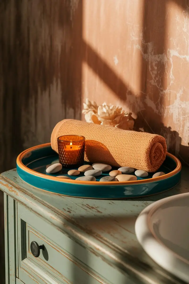 Bring a splash of color into your bathroom with a vibrant ceramic tray. These trays often come in fun patterns and bright hues, giving your space an energetic vibe!