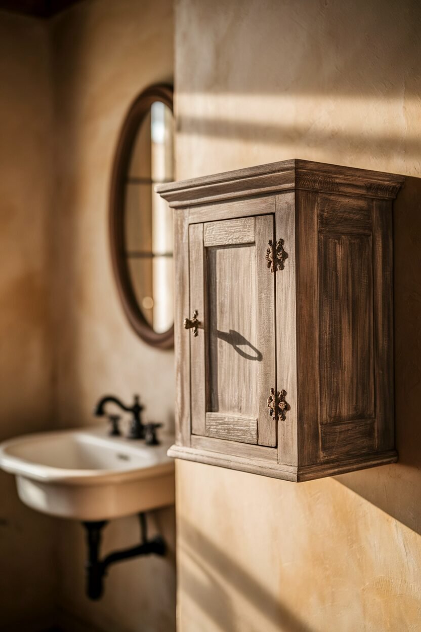 Imagine a charming cabinet made from reclaimed wood, adding a cozy touch to your bathroom. It brings nature indoors and creates a warm atmosphere that feels inviting and homey.