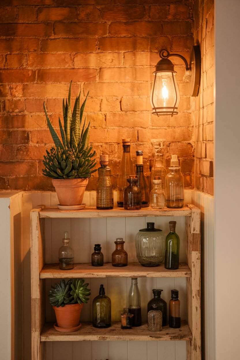 Try adding small potted plants or colorful jars to make it pop! Remember to secure them properly to the wall for safety.
