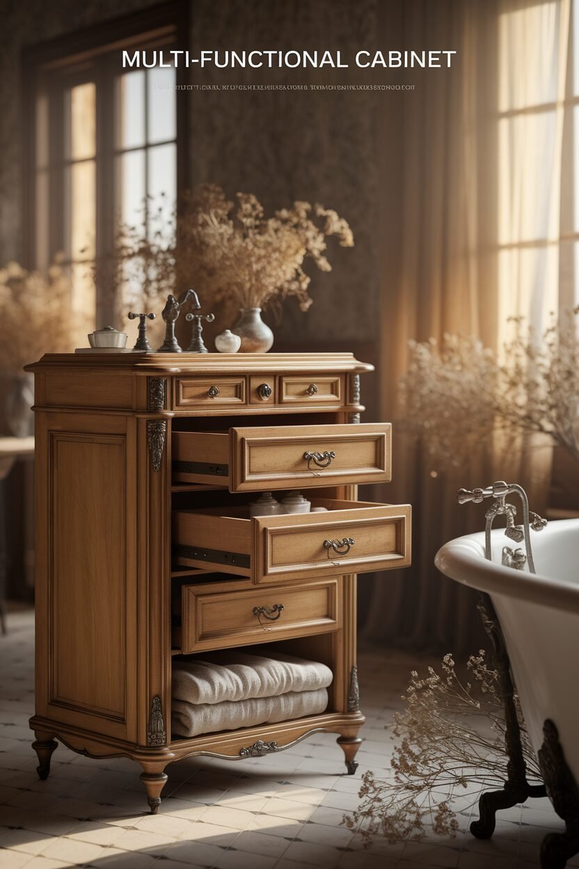 An elegant antique cabinet brings timeless beauty to your space. Its intricate designs and rich history can make your bathroom feel luxurious!