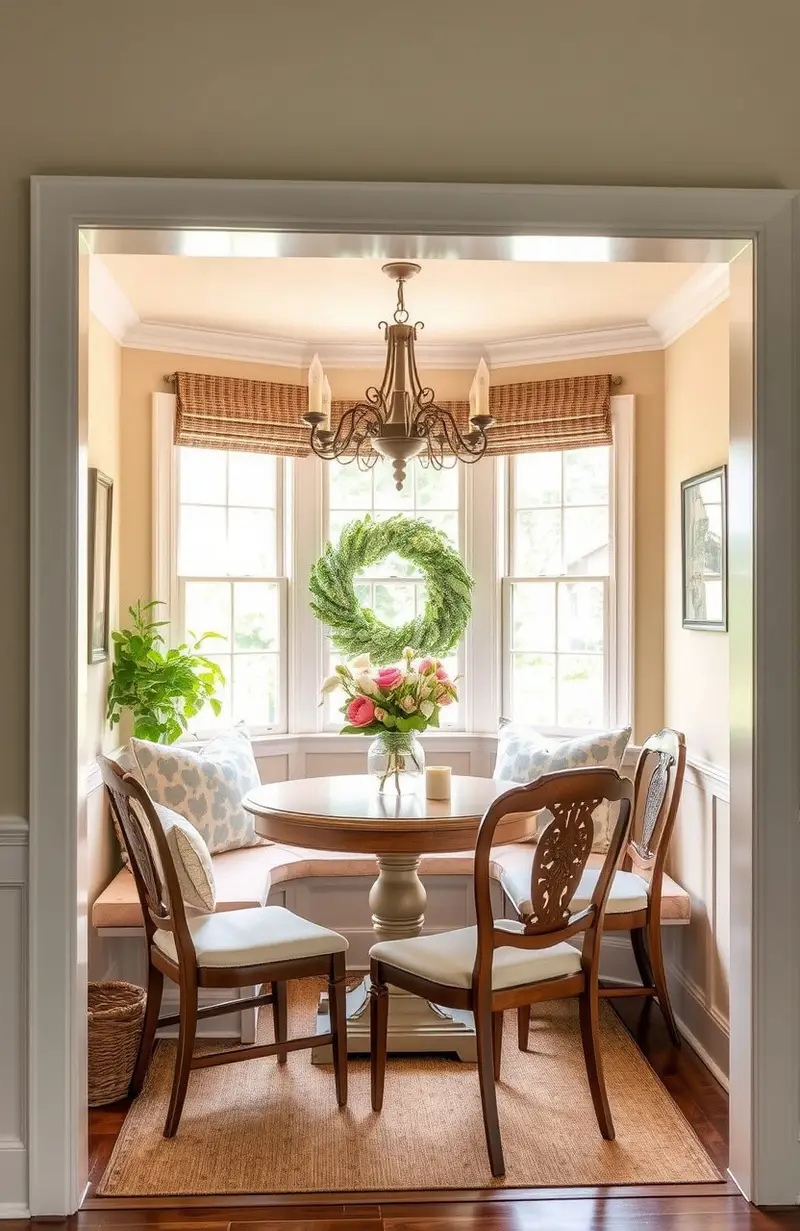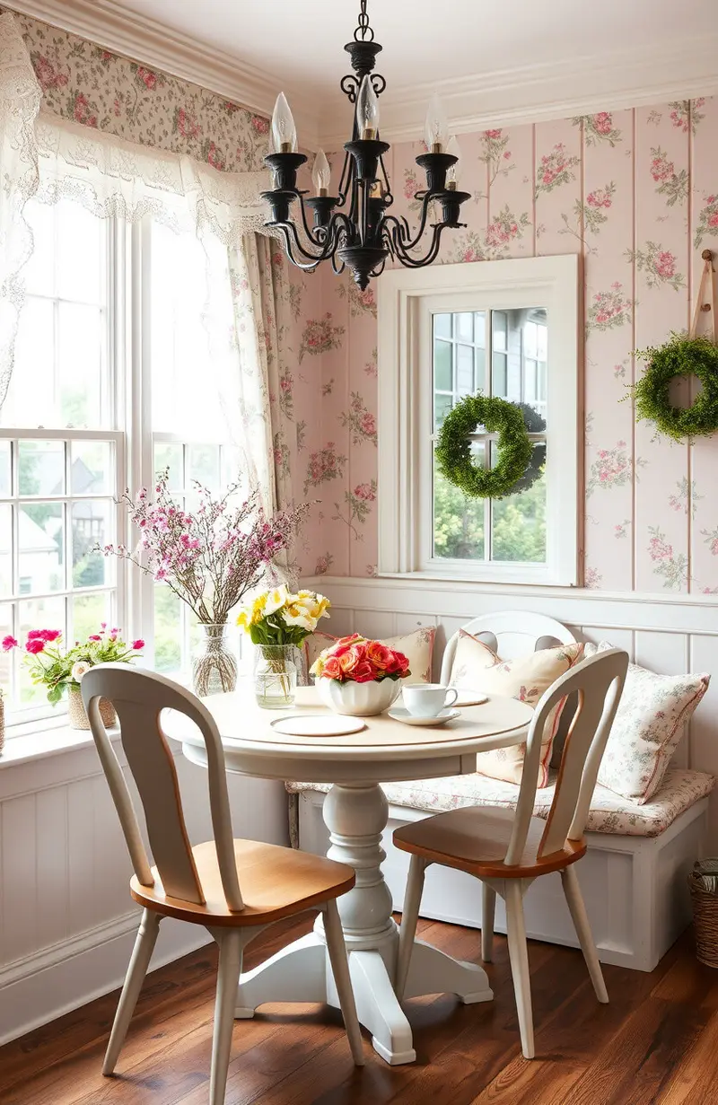 Bring the charm of a country cottage into your dining nook. Use floral patterns, pastel colors, and vintage finds.